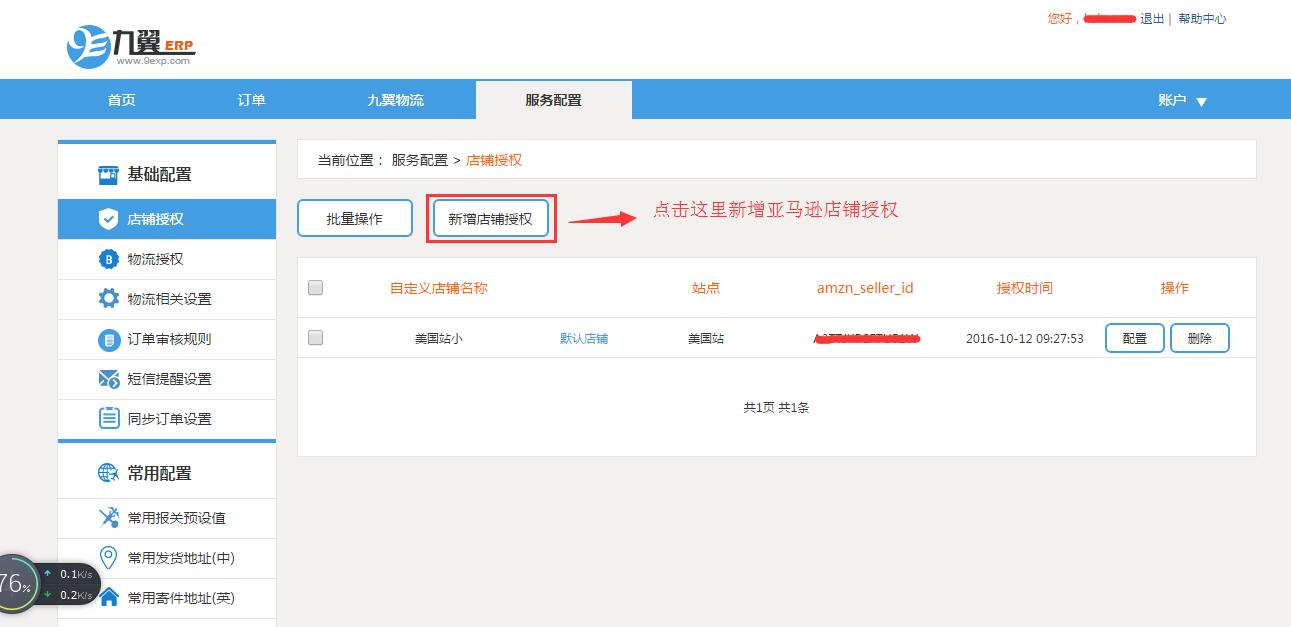 第一步:登录蓝沛进入服务配置——>店铺授权(如下图)